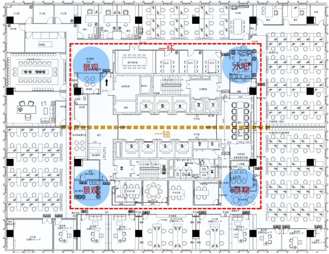 “一環” 作為空間主要的功能動線,簡潔明了,鏈接所有辦公板塊和領導辦公室,實現辦公效率的最大化。