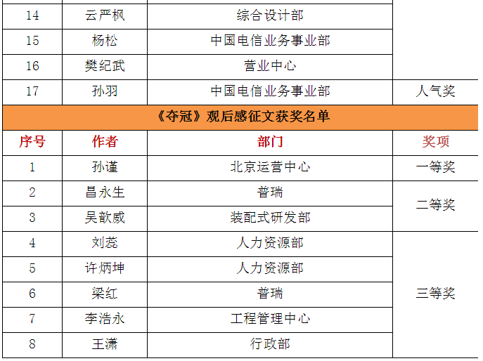 作為兩場(chǎng)征文比賽的評(píng)委之一,常宏品牌推廣部總監(jiān)張英宣向大家介紹了這兩場(chǎng)征文比賽的評(píng)選規(guī)則以及大致情況。常宏“宏鳥(niǎo)”征文大賽自征集以來(lái),共征集了174份參賽作品,經(jīng)過(guò)初評(píng)、復(fù)評(píng)、公示,共評(píng)選出了一名一等獎(jiǎng)、兩名二等獎(jiǎng)、三名三等獎(jiǎng)、十名鼓勵(lì)獎(jiǎng)以及一名人氣獎(jiǎng)。《奪冠》觀后感征文從87份作品中,共評(píng)選出了一名一等獎(jiǎng)、兩名二等獎(jiǎng)以及五名三等獎(jiǎng)。
