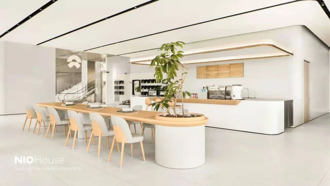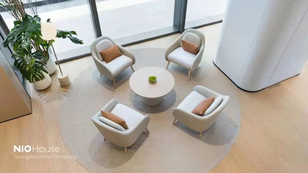 蔚來中心·廣州漢溪長隆牛屋采用2層結構,展廳一如既往地采用蔚來純粹、精致、科技感的風格,整體以米白色為主,不銹鋼鏡面頂面、水磨石墻面,搭配實木飾面設計,空間更加通透,更具未來感。
