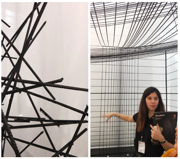 背景墻右邊是展區(qū)的入口,在此設(shè)計師用復(fù)雜而沒有規(guī)則的“鳥巢式”鋼筋做成了穹頂空間,代表著每一次設(shè)計都是從紛繁復(fù)雜的、千頭萬緒的情境中開始的,隨后鋼筋變成了有節(jié)奏和韻律的五線譜,即是設(shè)計終于理清的思路,向著光明進(jìn)發(fā)。
