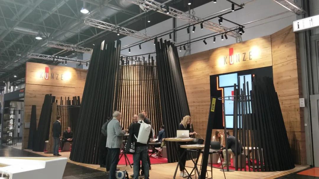 KUNZE這家公司的展區(qū)用線條組成了三個大小不同的圓錐體,圍合而成為洽談區(qū),很有設(shè)計公司的“范兒”。