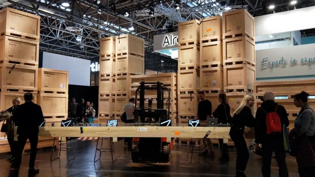 DART的展區(qū)則是用了大量的包裝箱,滿滿工業(yè)風(fēng)。據(jù)說每個箱子上有一個小孔,從小孔中望去是該公司做的一個個鮮活的案例,這也許就是對設(shè)計另外一種別致的展現(xiàn)方式。中央有一個長約6米的木質(zhì)展臺,干脆沒有桌腿,是被一臺叉車托舉著,挺佩服設(shè)計師和決策者的想法。