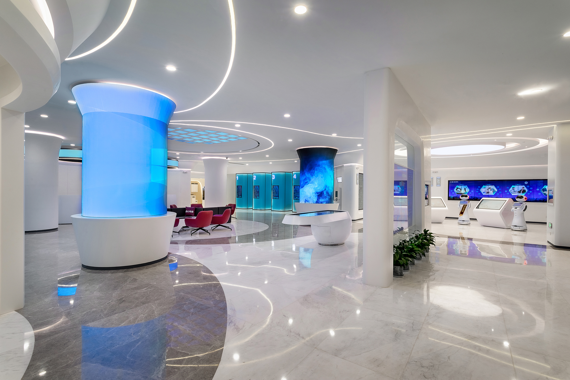 廳堂內明亮的光線,流動的波紋和多變的色彩,傳遞著穿越時空的設計語言,寓意時光的流逝、演變和發展;燈光和光帶如陽光一般從建筑的外立面延伸到室內空間,與設計主題相呼應;智能區屏幕上疾馳而過的復興號,講述著石家莊——火車拉來的城市的發展故事。冀州古鼎、定州瓷器、蔚縣剪紙等擺件及飾品,描述著“京畿福地,大美燕趙”的宏偉畫卷。